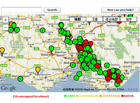 2009年,令130丧生的澳大利墨尔本北部的山林大火让Google开始重视火灾的应灾措施——他们开发了一套Flash地图用于跟踪整个火灾的状况。地图中标记出了着火地点,并用不同颜色代表了火势控制情况。