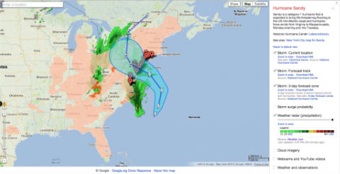 另一次Google面对飓风影响较大的动作是在2012年10月29日,Google开发了“Sandy”版地图,人们不仅可以跟踪“Sandy”在美国的行进路线,也能获取政府的警告信息,如撤离通知和风暴警报等。当然,Google也一如既往的提供气候数据、卫星图像、撤离路线和避难场所等信息。