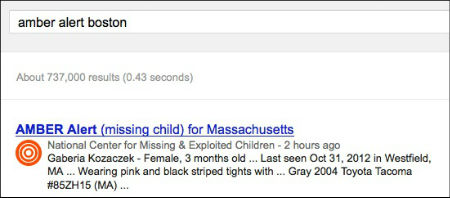除了自然灾害外,Google也致力于防止“人为灾难”的发生,例如在2012年11月谷歌日前宣布,将在搜索和地图产品中增加Amber报警系统,希望可以帮助警方寻找当地遭绑架儿童——只要搜索栏中输入的地点在事发地点的有效范围内,Google地图就会自动在事发地点处标注黄圈,列出失踪儿童的姓名、年龄、性别以及失踪的具体地点和时间。用户也可以进一步查看失踪儿童的外貌等警方提供的具体信息。