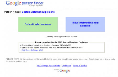 美国当地时间4月15日,在波士顿国际马拉松赛比赛的尾声阶段,终点线附近发生了至少两起爆炸,随后,,现已造成多人伤亡。为了防止恐怖分子通过电话远程操控炸弹,波士顿的电话网络被全部关闭,这让许多人之间突然失去了联系,为了应对这一情况,Google重启了Person Finder页面,在Person Finder上可以发布你想要联系的人或是你知道的信息,Google会将它们进行匹配,帮助用户寻找目标对象。