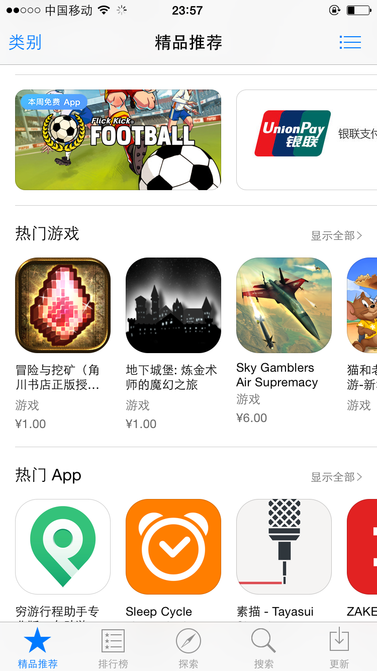 (3)中部Banner 1大图:一般是7张,依次是本周免费App/银联支付/游戏/儿童/App Store精华/编辑选荐/按类别浏览,其中儿童是主题性质的;