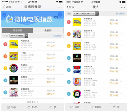 为了使电视台、广告主更好的衡量电视节目在微博上的热度,在继今年7月微博和CSM推出微博电视指数beta版后,微博电视指数全新改版,新版微博电视指数在体现节目播出时段热度的日榜基础上,新推出了周榜。周榜从每周一0:00时起,至每周日24:00时,把本周内播出的综艺节目按照阅读人数和次数、提及人数和次数四个维度进行统计,从而得出本周综艺节目的热度。