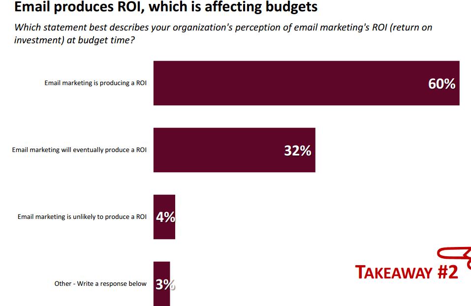 60%的受访者表示,邮件营销正在产生一个投资回报率,32%相信邮件营销最终会产生ROI,4%认为邮件营销不太可能为企业带来ROI。