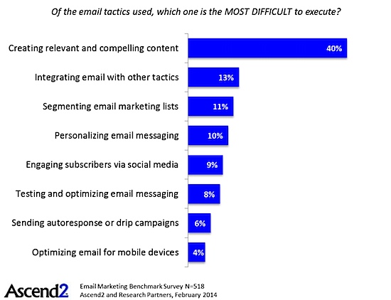 40%的使用了相关和引人注目的内容策略的受访者表示,建立这些内容策略并执行它是最困难的策略。13%受访者表示邮件融合其他策略最困难。