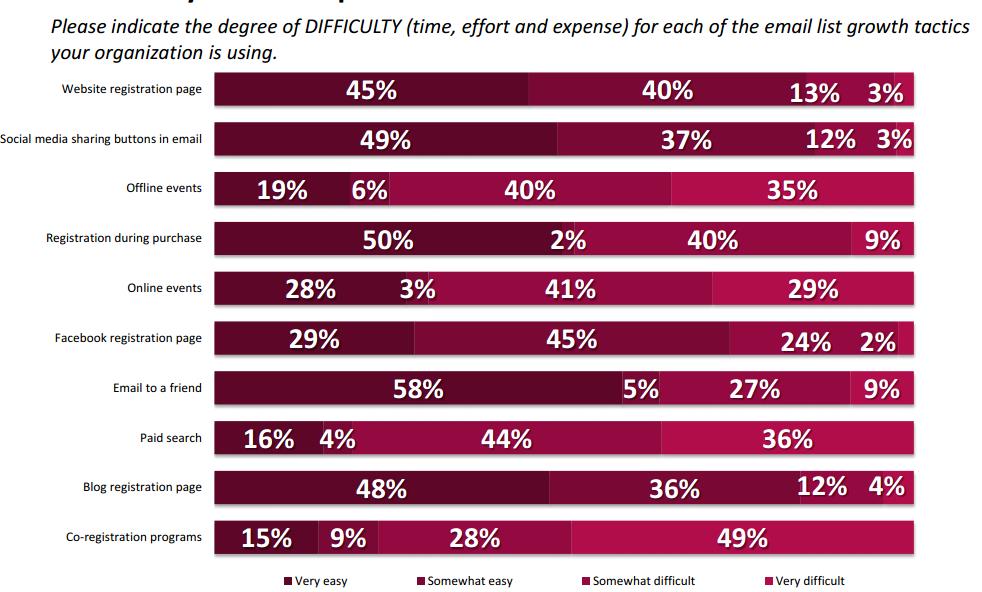 市场营销人员利用网站注册页面、邮件社交媒体分享按钮、线下活动、购买期间的注册、线上活动、facebook(社交媒体)注册页面、邮件转发好友、付费搜索、博客登陆页面、联合注册活动等来增加邮件用户列表。其中受访者普遍认为,邮件转发朋友(58%)、购买期间注册(50%)、邮件社交媒体分享按钮(49%)、博客注册页面(48%)等是最容易实现用户列表增长的方式。而受访者表示,利用联合注册活动(49%)、付费搜索(36%)、线下活动(35%)等搜集用户列表非常难。