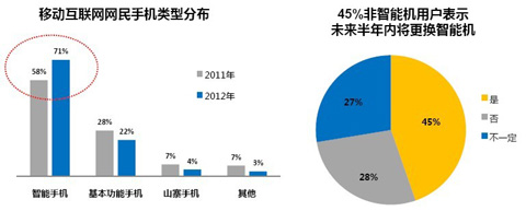 在使用非智能机的移动互联网网民中,45%明确表示会在半年内更换智能机,27%可能会更换,智能手机将逐渐成为主流。