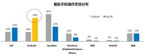 36%的移动互联网网民使用Android系统,比2011上升22%,其次为Symbian和iOS,Android已超越Symbian占据市场主导,未来iOS和Android的竞争将愈加激烈。