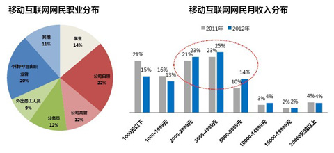 在收入方面,月收入2000元以上的用户占总人群的72%,比2011年增加了9%,低收入人群比例下降,中等收入比例上升。