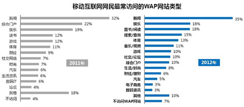 新闻类依旧是移动互联网网民最常访问的WAP网站类型,其次是娱乐类和图书/阅读类;