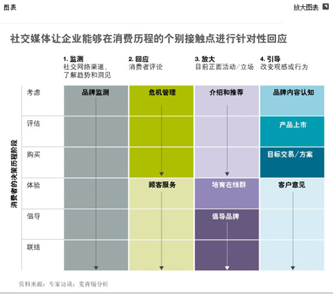 营销的首要目标是在恰当的时机或者某些接触点影响消费者的购买行为。三年前,麦肯锡提出了“消费者的决策历程”框架,用以了解在消费者的购买决策中,企业如何与之互动。这一框架把消费者行为描述成包含多个反应圈的迂回历程,与传统将消费者购买行为视为直线进展迥乎不同。在消费者的决策历程中,社交媒体是一个独特的构成要素:它是唯一能在每个阶段都接触到消费者的工具:从消费者考虑品牌产品,到完成购买之后的一段时间,消费者的经验仍会影响其偏爱的品牌,其倡导也会影响他人的购买决策。