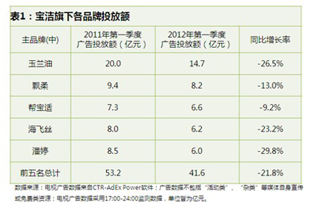 在电视媒体,五大传统行业的投放额占到电视广告总体投放额的64.5%,化妆品行业领跑广告投放,但从增长情况看,投放明显收缩,宝洁做为这一行业的的主力投放广告主,