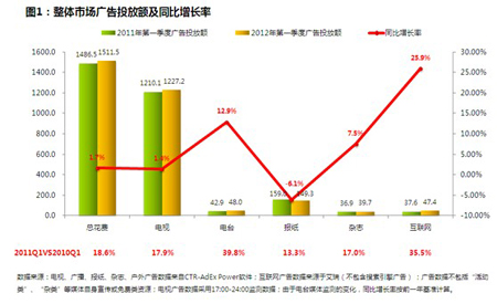 2012年一季度,中国广告市场整体投放同比增幅仅1.7%,低于中国GDP8.1%的同比增长,为近年来最低增幅。受新媒体广告分流以及主要行业广告投放疲态等诸多影响,传统媒体广告市场刊例花费增长幅度进一步收缩。五大媒体中,电视媒体继续占据着广告量的头把交椅,但增长速度呈现出放缓的趋势;电台继续维持着较高的增长,但增幅低于去年同期,为12.9%;报纸出现萎缩,同比下降6.1%;杂志同比增长7.5%;互联网高速增长的势头也明显减慢,增幅为25.9%,中国广告市场进入慢车道发展(见图1)。
