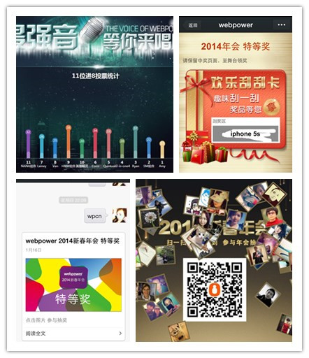 众所周知,webpower中国区目前是中国最大的邮件营销服务商,专注于邮件与短信、微信、APP等多渠道个性化会员营销服务。此次新春年会最大的亮点也在于对时下最流行的社交媒体工具--微信的"独创性"运用。得益于webpower中国区对微信营销应用的技术创新及研发,无论是年会现场签到、或是"webpower最强音"实时互动投票、又或者是众所期待的抽奖环节,观众完全通过移动端微信轻松参与完成,整场年会处处充满着欢乐与互动。