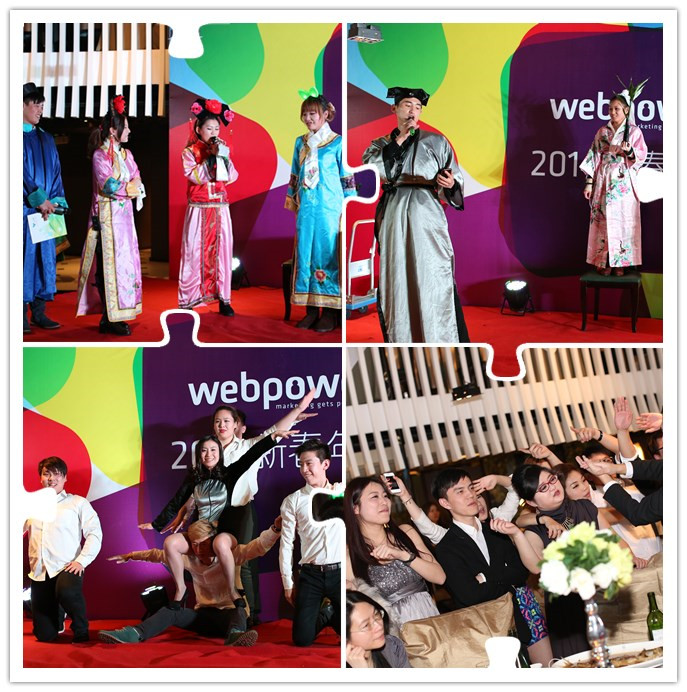 在所有领导完成2013年的汇报总结及新年计划后,2014年新春年会正式拉开了序幕。webpower中国区的员工们为本次年会精心准备了各式各样的演出节目。从白娘子到后宫甄嬛传,幽默诙谐的情景小品总能够另人捧腹大笑;从Hip-pop街舞到高难度的机械舞表演,火辣热舞往往都是最受瞩目,精彩纷呈的表演无不印证着webpower中国区青春蓬勃之气,同时也秉承着"鲜活乐趣、热情专注、革新超越、互尊友爱"的企业文化及品牌价值观。